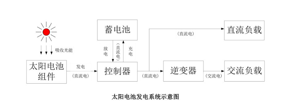 光伏发电系统由光伏方阵(光伏方阵由光伏组件串并联而成)、控制器、蓄电池组、直流/交流逆变器等部分组成。光伏发电系统的核心部件是光伏组件,而光伏组件又是由光伏电池串、并联并封装而成,它将太阳的光能直接转化为电能。光伏组件产生的电为直流电,我们可以直接以直流电的形式应用,也可以用逆变器将其转换成为交流电,加以应用。从另一个角度来看,对于光伏系统产生的电能我们可以即发即用,也可以用蓄申池等储能装置将电能存放起来,按照需要随时释放出来使用。