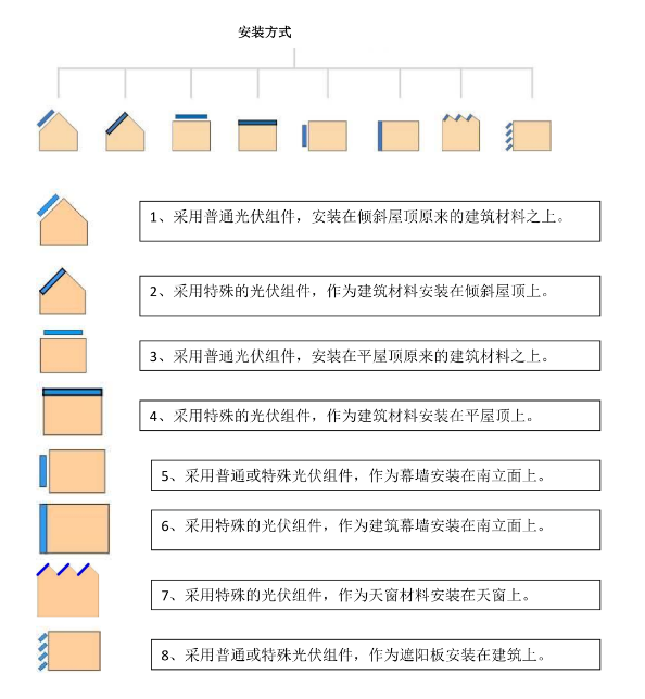 BIPV:采用特殊设计的专用光伏组件,安装时替代原有的建筑材料或建筑构件,与建筑融为一体的光伏系统。拆除光伏组件则建筑不能正常使用。光伏组件不仅要满足光伏发电的功能要求同时首先必须满足建筑的基本功能要求,如坚固耐用、保温隔热、防水防潮、适当强度和刚度等性能,常见的有光伏瓦、光伏幕墙、光伏天棚、光伏窗和光伏遮阳棚或遮阳板。BAPV:采用普通光伏组件,在原有建筑上安装,并不替代建筑材料或建筑构件,直接安装到屋顶或附加在墙面的光伏系统。拆除此建筑上的光伏组件,并不会影响原有建筑的基本功能。